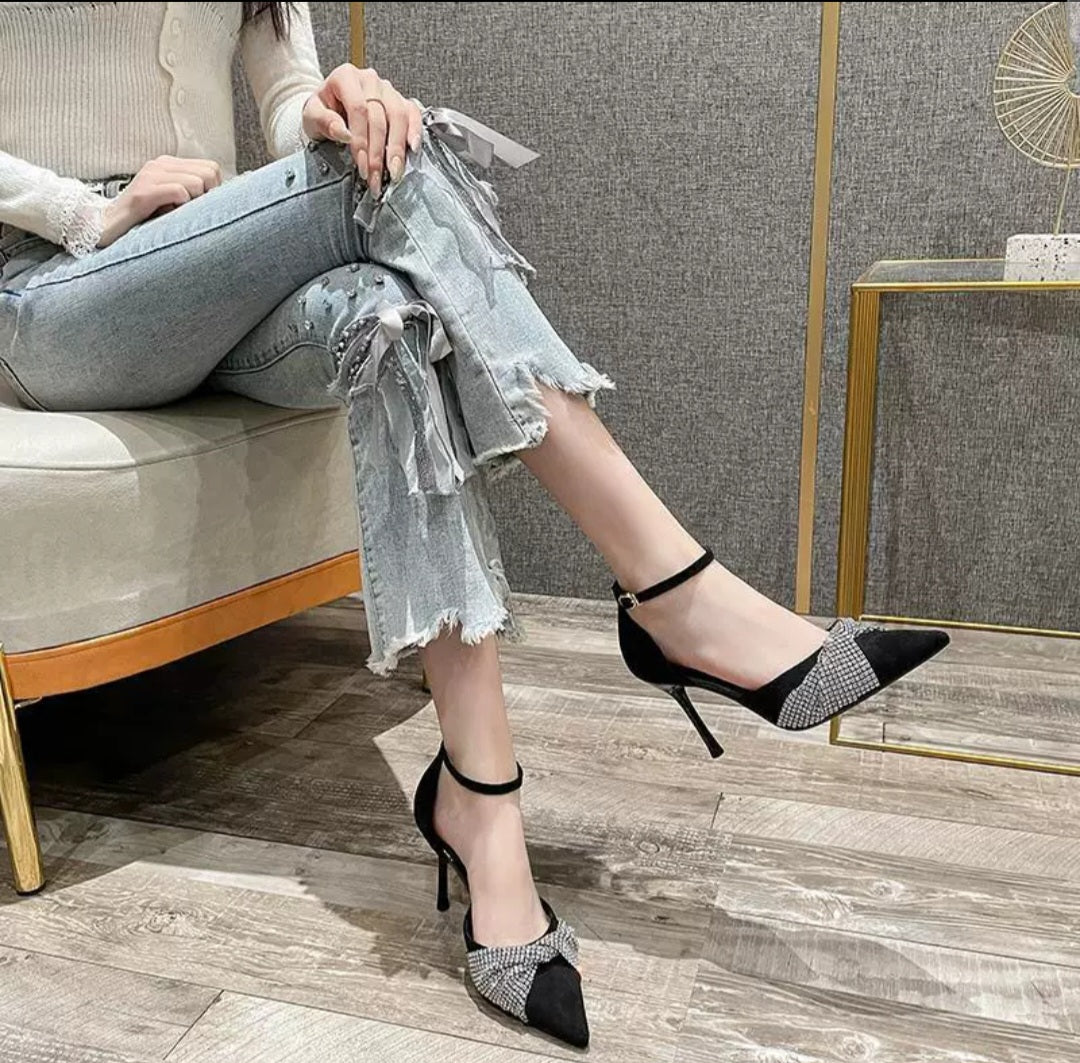 These women’s black stiletto heels featuring a pointed toe and a dazzling rhinestone bow detail. Designed with an ankle strap for a secure fit, they blend luxury with modern elegance. Perfect for evening parties, cocktail nights, receptions, and festive occasions,...
