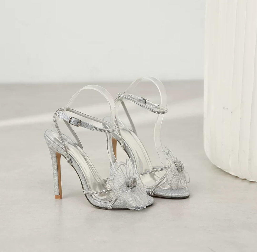 Step into sparkle with these silver open-toe high heels, crafted from glittery, shimmery material and adorned with a beautiful flower detail. Perfect for weddings, parties, and evening events, these elegant heels offer the perfect blend of glamour and grace.