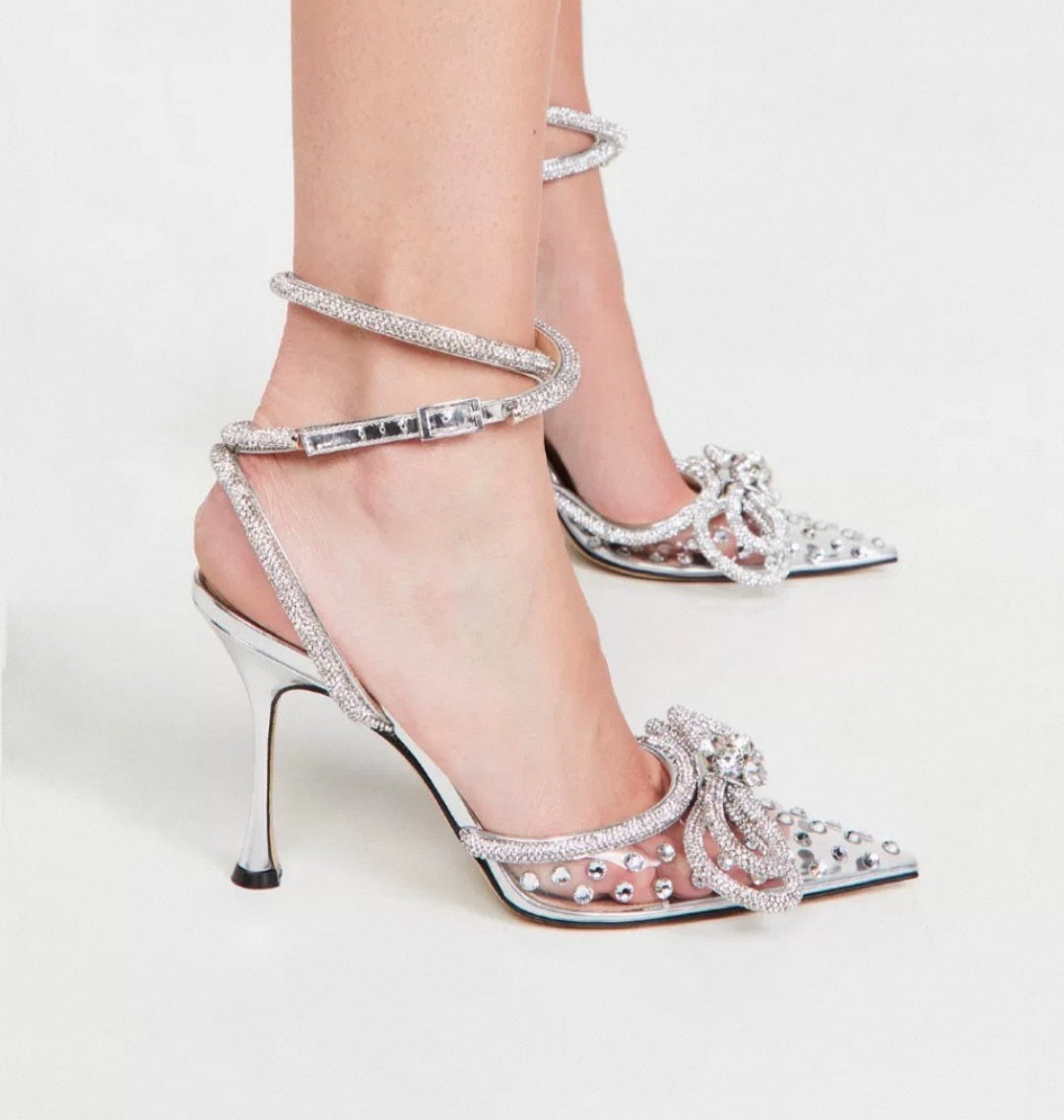 Mach & Mach inspired stiletto heels. Featuring a pointed toe, rhinestone bow, and sparkling ankle wrap straps, these designer-inspired heels are perfect for weddings, and luxury formal events..