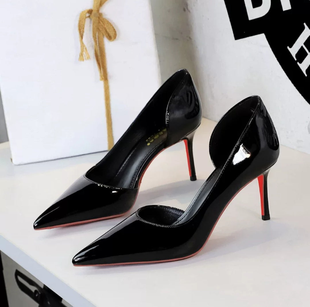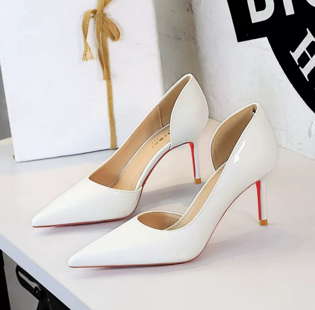 Elevate your look with our elegant and versatile nude, black, and white court shoes. Crafted from glossy shiny leather, these stylish heels feature a chic side-cut design. The perfect choice for office wear or a night out, these medium-height heels...
