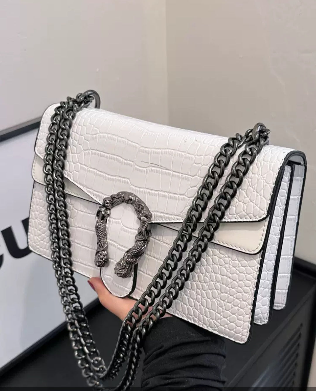 Make a statement with this white Gucci-inspired shoulder bag, designed with a bold heavy metal chain. Bigger than standard sizes, it offers premium quality with standout style.
