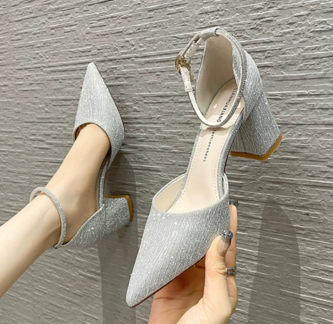 These block heel pumps in silver and gold, both featuring a shimmering finish that adds instant elegance to any outfit. Designed with a pointed toe and a slim ankle strap and a block heel. Perfect as wedding shoes, party wear,...