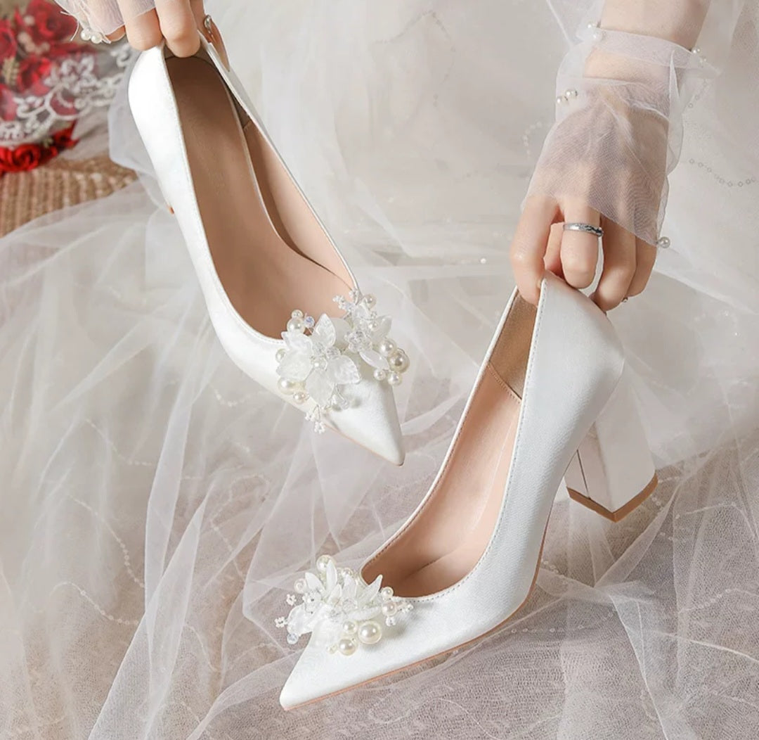 Walk with grace in these women’s white block heels featuring a pointed toe and delicate pearl-floral embellishments. Crafted in satin with a sturdy block heel, they combine elegance and comfort for long wear. Perfect for brides, nikkah ceremonies, engagement parties,...