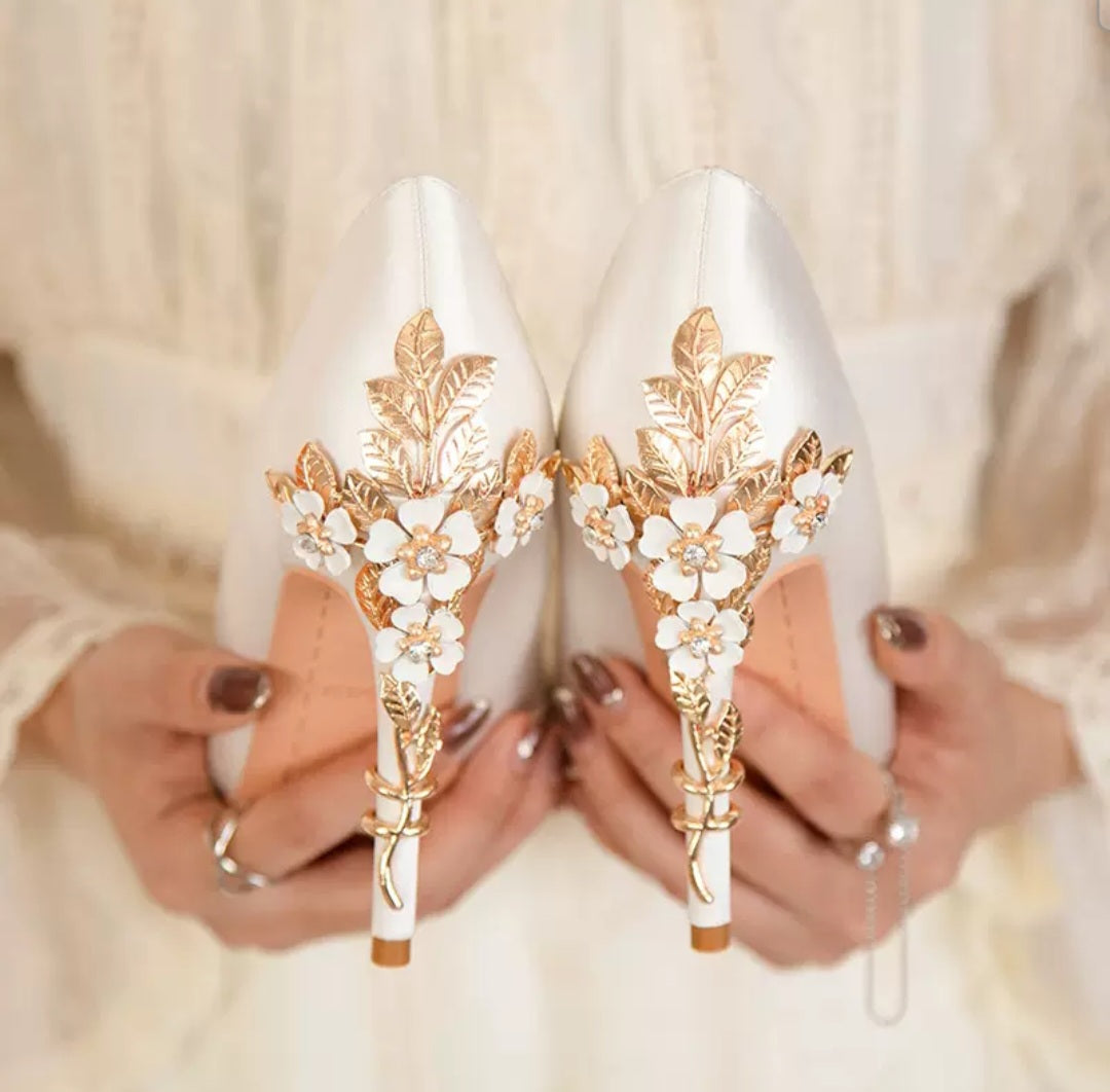 Add regal charm to your style with these women’s embellished stiletto heels available in white, black, red, blue, and gold. Designed with satin finish and adorned with 3D floral and golden leaf appliqué on the heel, they radiate elegance and...