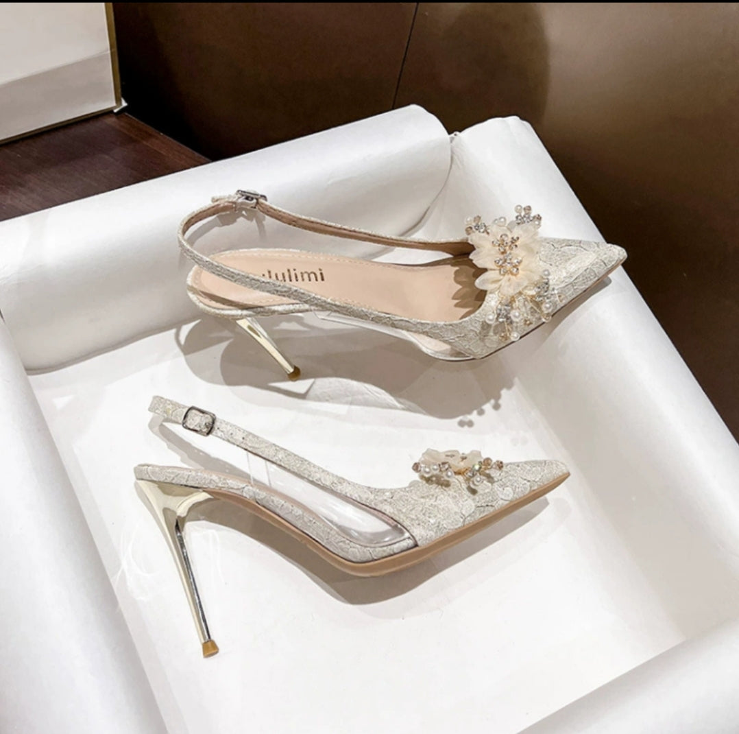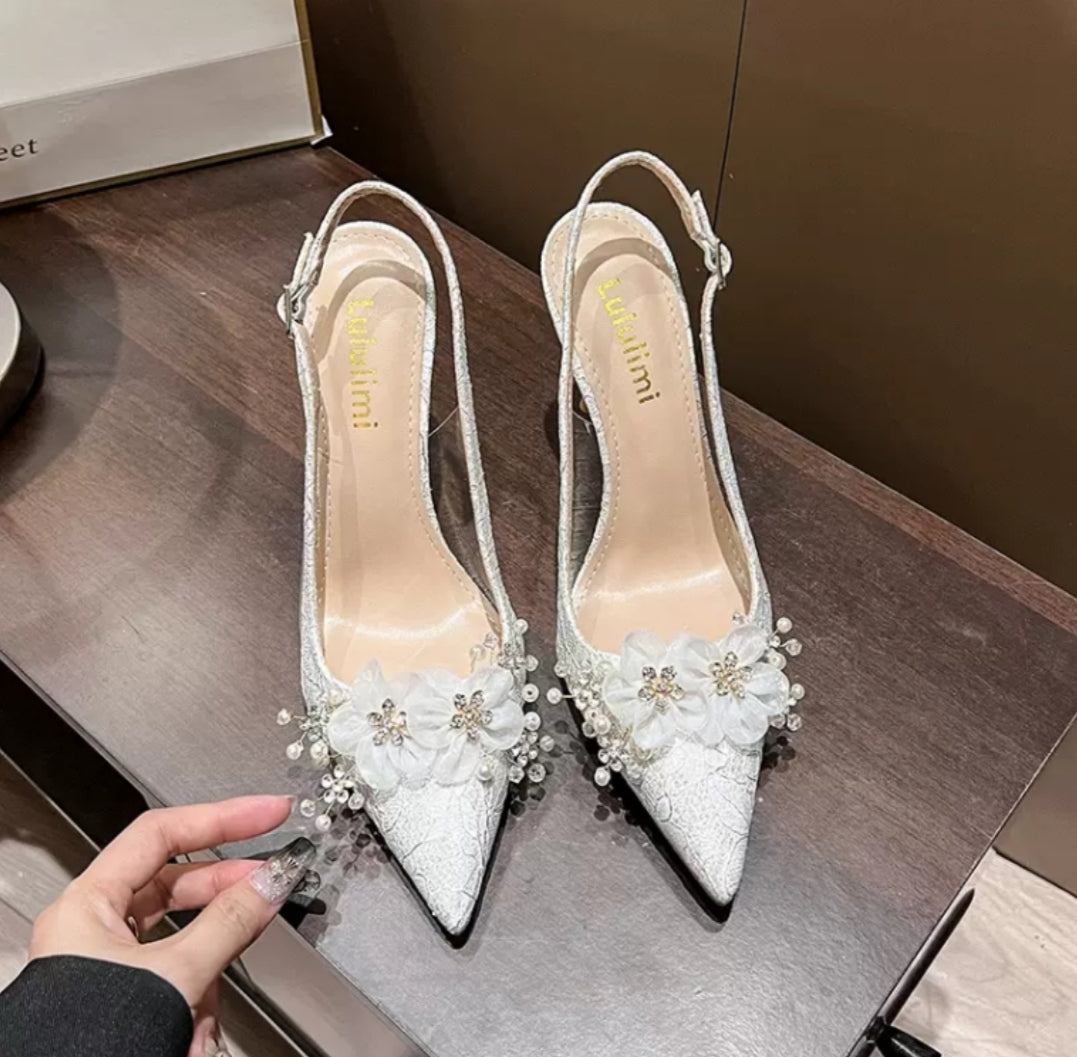 These gold and silver slingback heels feature a pointed toe with delicate floral and pearl embellishments, giving them a romantic and luxurious charm. Designed with a slim stiletto heel, they provide both elegance and height, perfect for complementing gowns and...