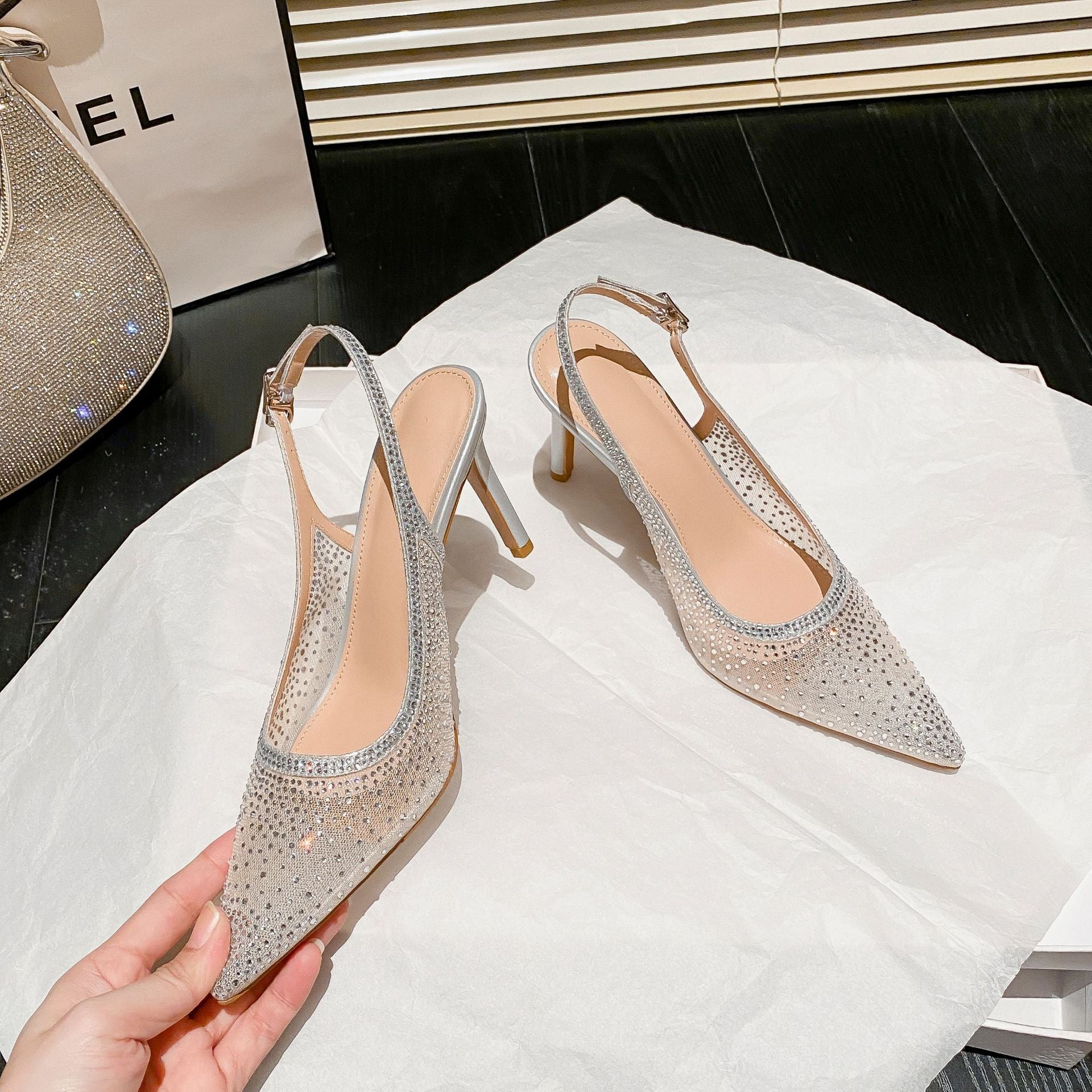 Women's slingback heels are all about subtle glamour, featuring a pointed toe with delicate crystal detailing for a refined sparkle. The slim heel adds graceful height, while the slingback strap ensures a secure and comfortable fit. Perfect for parties, formal...