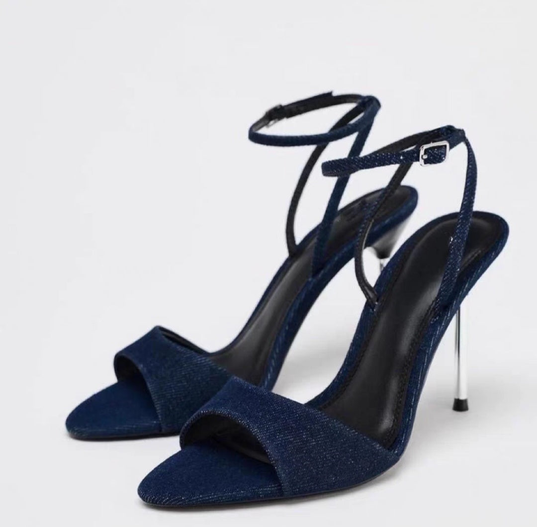Turn heads with these indigo denim stiletto sandals, where casual fabric meets high-fashion design. Featuring a wide front strap and a slim ankle buckle strap, they balance comfort with chic elegance. The metallic high stiletto heel adds a bold, modern...